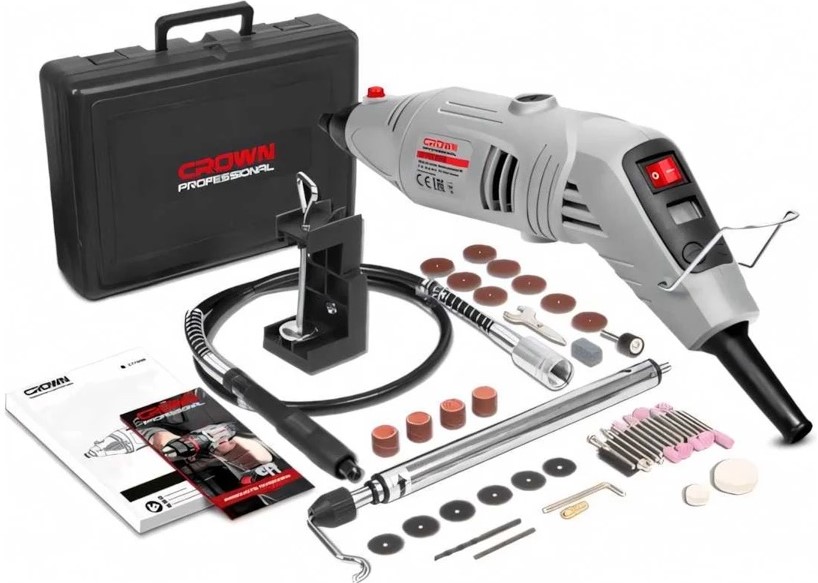 Электрический гравер (дремель) CROWN CT13428 BMC предназначен для тонкого шлифования, резки, полировки, гравировки и заточки различных материалов — металла, древесины, пластика, керамики, мрамора и других. Благодаря высокой точности и широкому выбору оснастки инструмент подходит для моделирования, ремонта, художественных работ, ювелирных операций, обработки труднодоступных зон и мелких деталей.