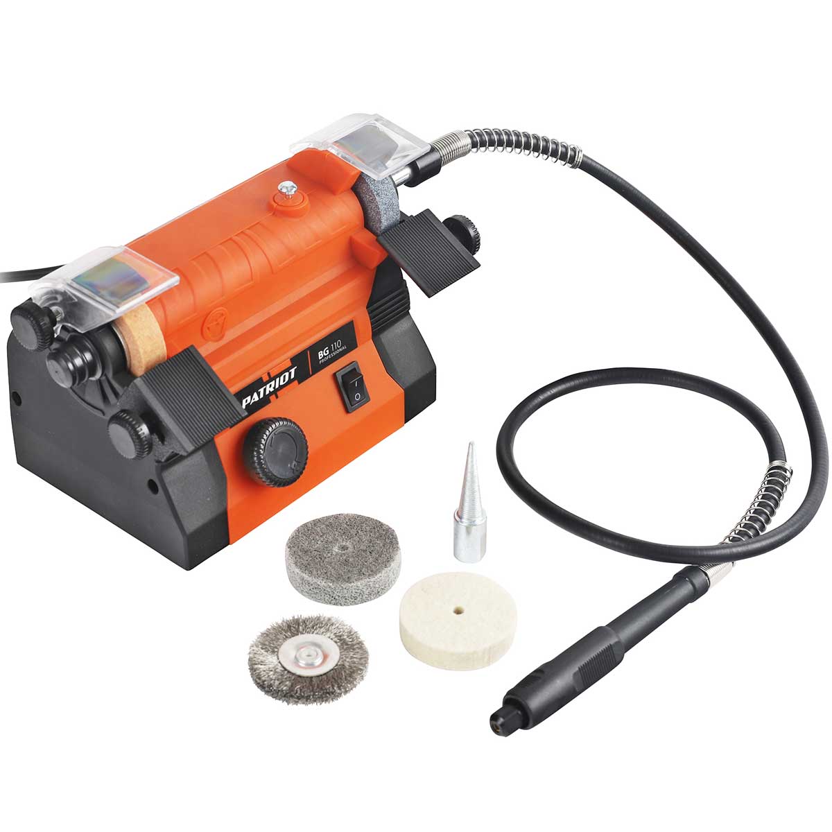 Точильный электрический станок PATRIOT BG 110 с гибким валом длиной 105 см предназначен для обточки, шлифовки и полировки разнообразных изделий.