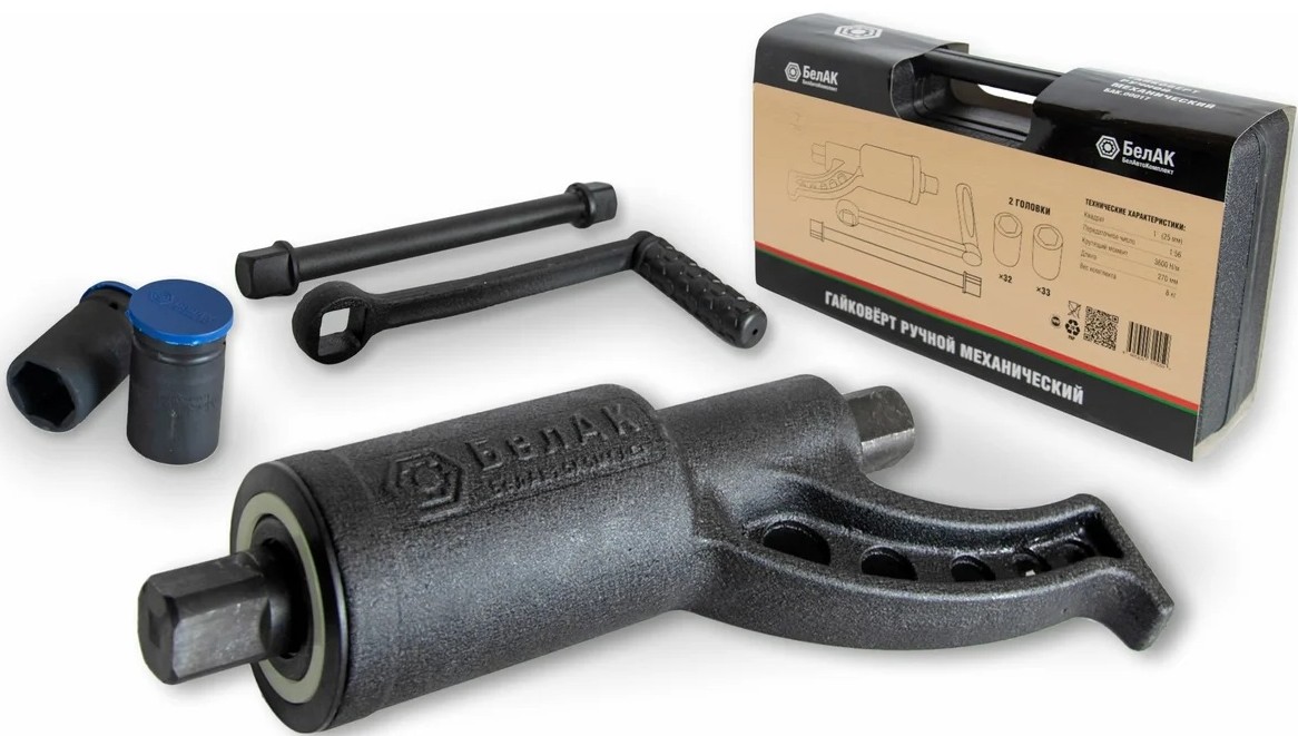 Двухскоростной механический гайковерт 32х33 БелАК БАК.00117 предназначен для закручивания и откручивания тяжело нагруженных болтов и гаек при проведении шиномонтажных работ на грузовых автомобилях. Усиление крутящего момента осуществляется за счет планетарного трёхступенчатого редуктора, обеспечивающего увеличение приложенного усилия до 56 раз.