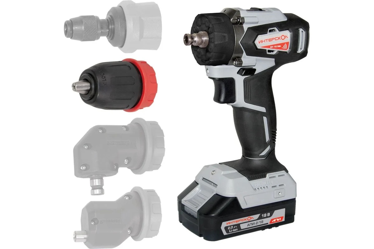 - Совместимость с дополнительными насадками: эксцентриковой, угловой и HEX ¼”.